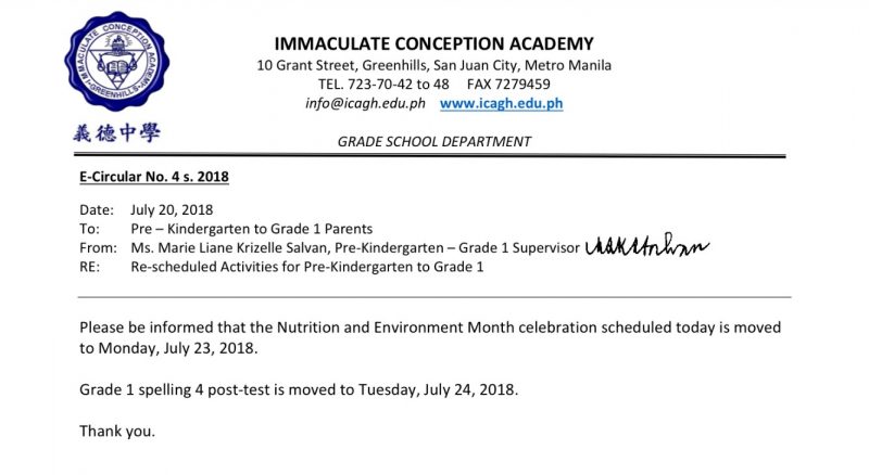 Re-scheduled Activities for Pre-Kindergarten to Grade 1 - Immaculate Conception Academy