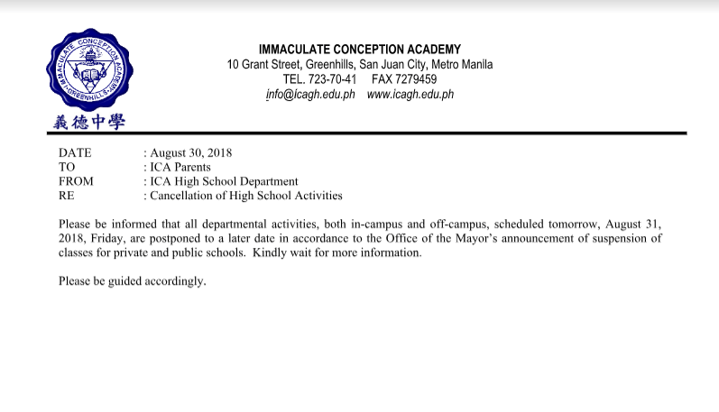 Please be informed that all departmental activities, both in-campus and off-campus, scheduled tomorrow, August 31,