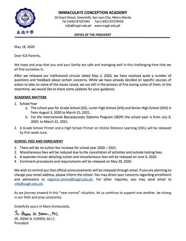 ICA Greenhills is a non-stock, non-profit elementary and secondary school owned and directed by the Missionary Sisters of the Immaculate Conception (MIC).