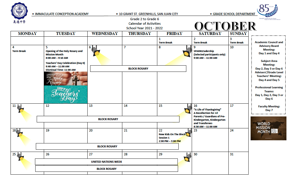28 Sep Grade 2 to Grade 6 October 2021 Calendar of Activities Posted at 16:35h in Announcements, Circulars by icaadmin 1 Comment Share Spread the loveHere is a calendar of activities for the month of October 2021. Tags: calendar of activities, october 2021
