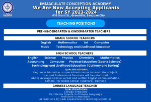 ICA Greenhills is a non-stock, non-profit elementary and secondary school owned and directed by the Missionary Sisters of the Immaculate Conception (MIC).